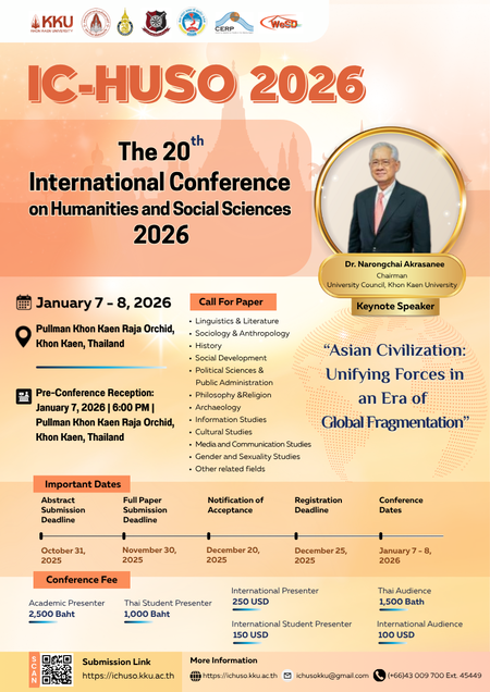 The conference employs a rigorous peer review process for all submitted papers. Each paper is reviewed by two experts in the relevant field. All accepted papers that meet the conference's standards will be published in the conference's online proceedings. Some full papers will be selected for publication in one of our following journals: 1) The Journal of Humanities and Social Sciences (HUSO KKU) eISSN:3027-7876 TCI-TIER 2 2) Journal of Language, Religion and Culture eISSN:2697-5637 TCI-TIER 2